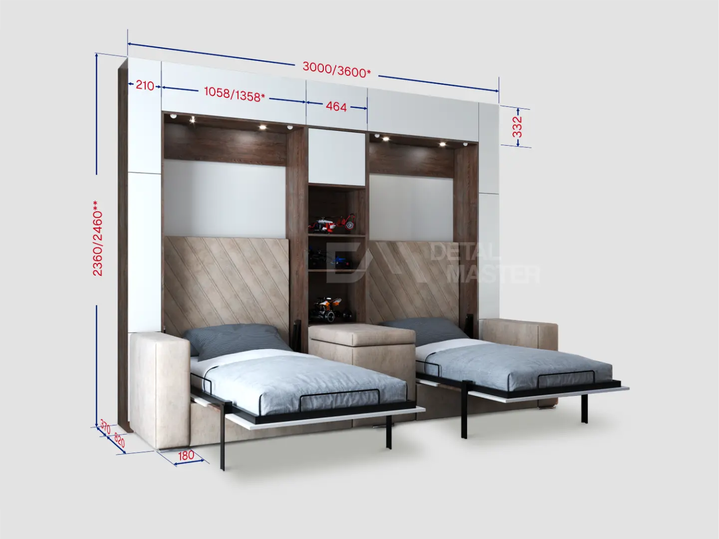 Дополнительные опции, такие как: освещение, зарядное устройство, розетки, мягкое изголовье, матрас, мягкий борт - не входят в стоимость шкаф-кровати "Twin 2.0". Вы всегда можете самостоятельно их добавить в опциях или написать менеджеру при оформлении заказа.